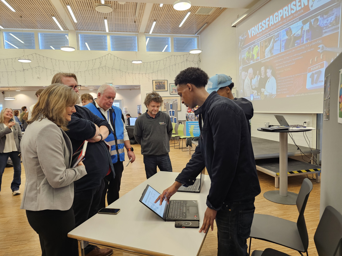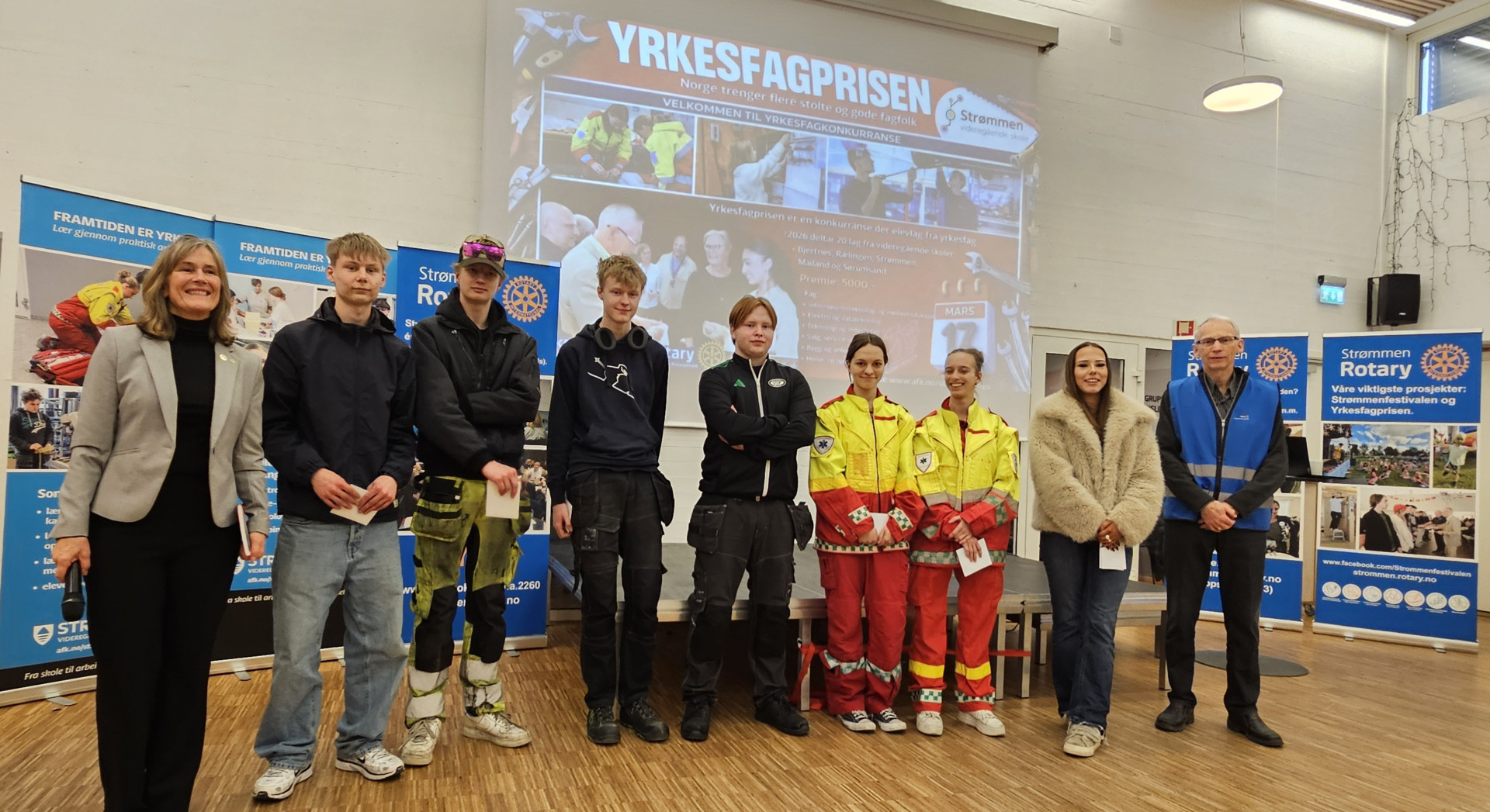 Industri- og bilmekaniker: Noah-Sebastian Stendebakken Halvorsen og Magnus Elias Kappev (Strømmen VGS), Elektro og automatikk: Johannes Hanvold og Adrian Pettersen (Strømmen VGS), Helse- og oppvekst samt ambulansefag: Elena Isabel Felpeto og Oliwia Dale (Strømmen VGS), Salg, reiseliv og servicefaget: Erle Andreassen Barvang (Rælingen VGS). I tillegg er juryleder Marit Lensjø (OsloMET) til venstre på bildet og Strømmen Rotary-representant som delte ut premiene, Gunnar Fr. Aasgaard, til høyre.