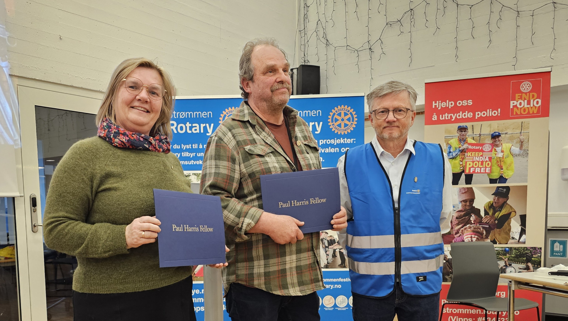 Bilde: Fra venstre Tone Farbu Lundbye (assisterende rektor i Bente Dretviks fravør), Lars Jakob Berg og Tage Bryn (president i Strømmen Rotaryklubb).